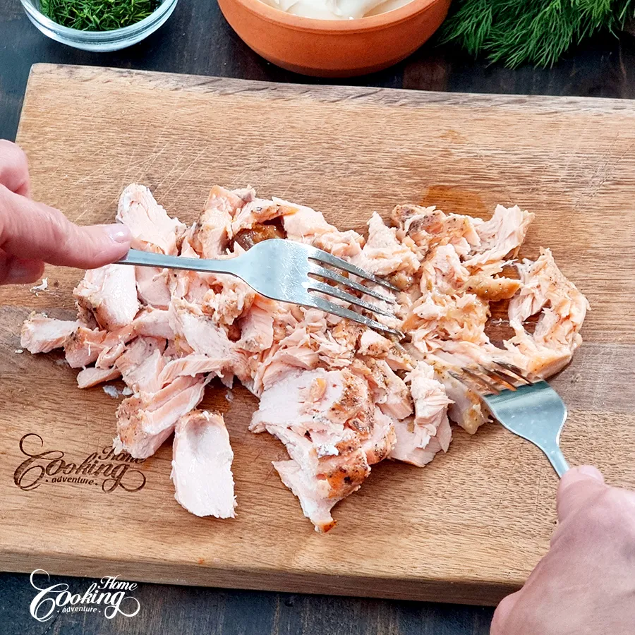 Flake the baked salmon into small pieces, making sure to remove any bones and skin.