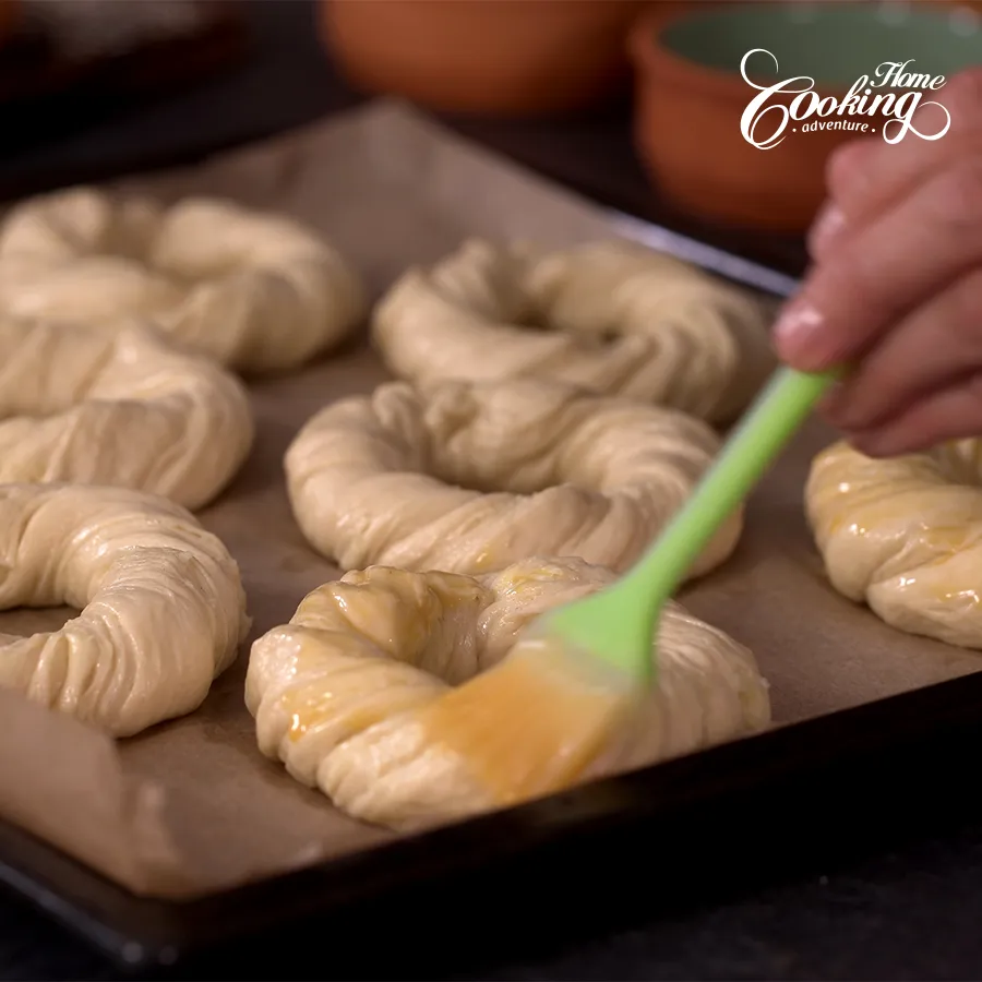 Twist each piece and bring the ends together, pinch the ends and place on a parchment paper baking sheet.